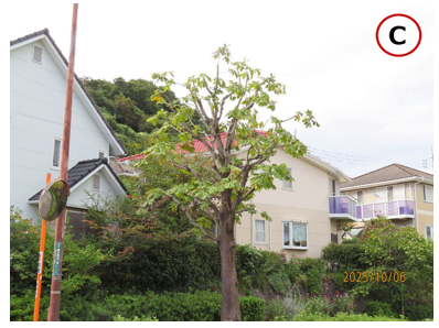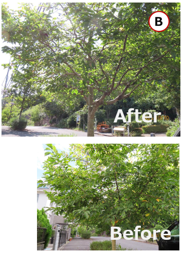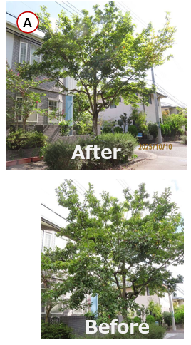• 自治会館前の2本の街路樹(コブシA、B)は伸びた枝が垂れ下がり、歩行の邪魔になっており、カットが必要
