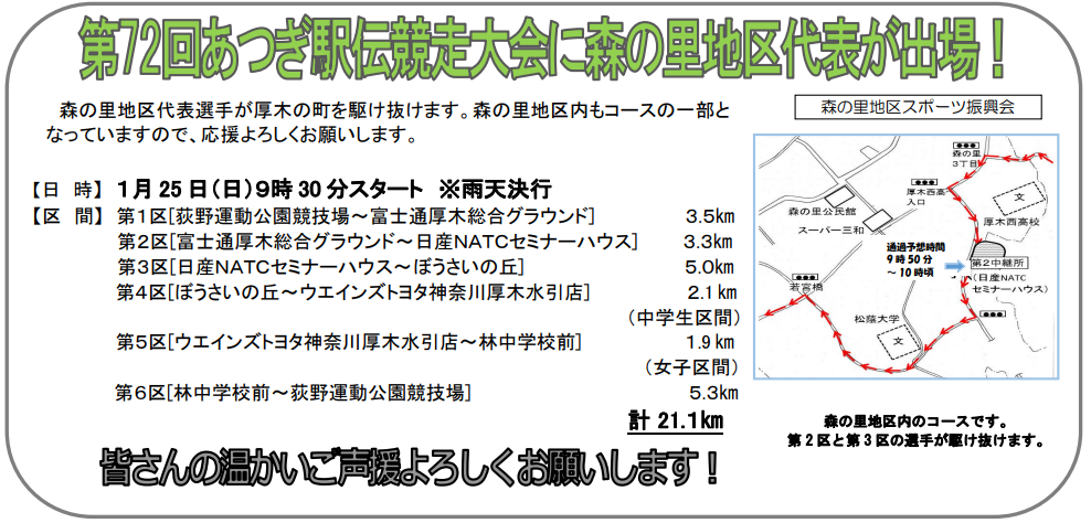 厚木市制70周年記念第72回あつぎ駅伝競走大会が令和8年1月25日(日曜日)に開催されます。森の里近辺でも交通規制があるかもしれませんのでお気をつけください。