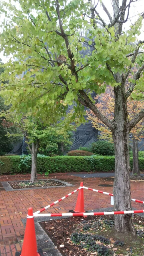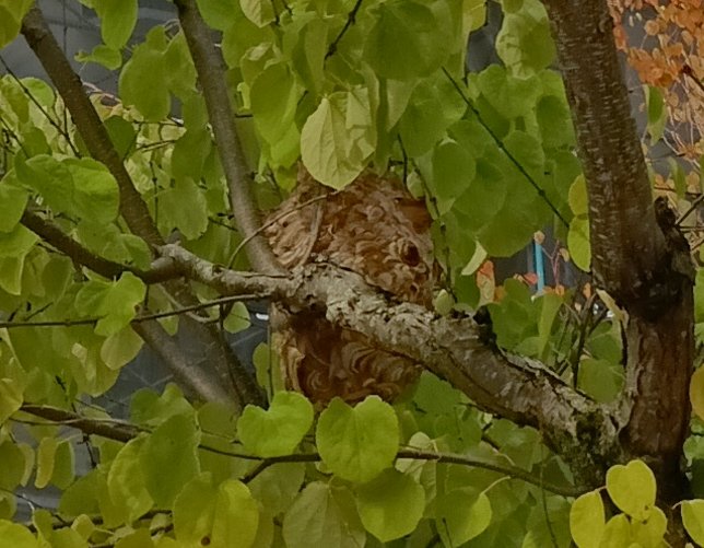 昨日、公民館の裏にある四季の路の街路樹の上方に『赤ちゃんの頭位の大きさのハチの巣」を見つけた方が公民館に連絡したとの事。