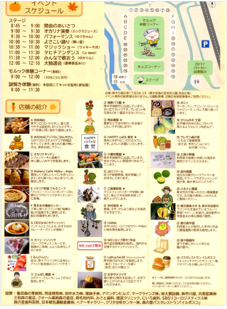 野菜・地元グルメ・手作り品の販売、モルック体験コーナー(無料)、イベント(オカリナ演奏、パフォーマンス等)、白バイ・パトカー展示・試乗体験、キッズコーナー(輪投げ・パターゴルフ等)、綿菓子・ポップコーンコーナー(子ども無料)、謎解き体験(無料)
