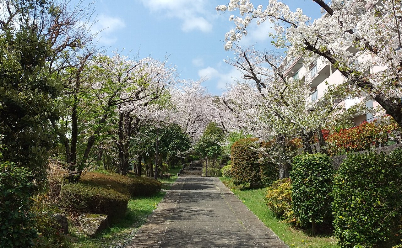 「春の路」は、森の里中央部を東西に結ぶ「七沢森林公園入口」から「森の里センター(2F)」を経て「高松山登山口」までにつながる路です。春は、小学校の入学式頃に桜並木が見事です。西側住宅地区では、階段の多い路となっていて、3・5・7段ずつ組み合わせた階段や乳母車、自転車用の斜路も併設されています。