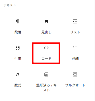 または、コードブロックを使う: +ボタンから「コード」ブロックを追加し、その中にショートコードを記述すれば、ショートコードをそのまま表示できます。