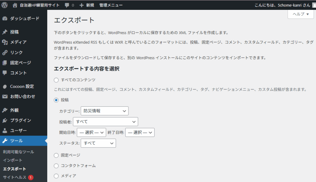 WordPressの管理画面(ダッシュボード)にログインます。 - [ツール] → [エクスポート] を選択