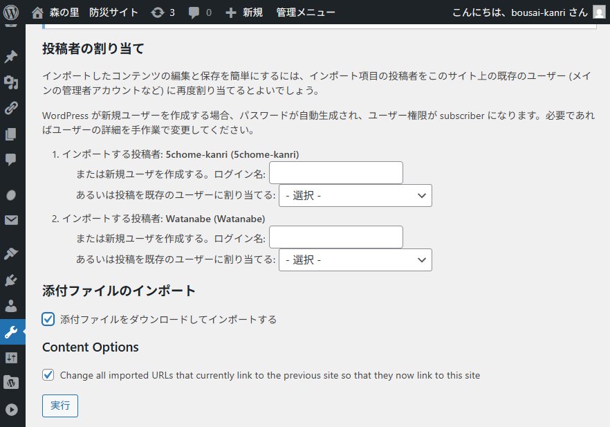 「WordPress」の「インポータ―の実行」をクリックします。 - .xmlファイルをアップロード