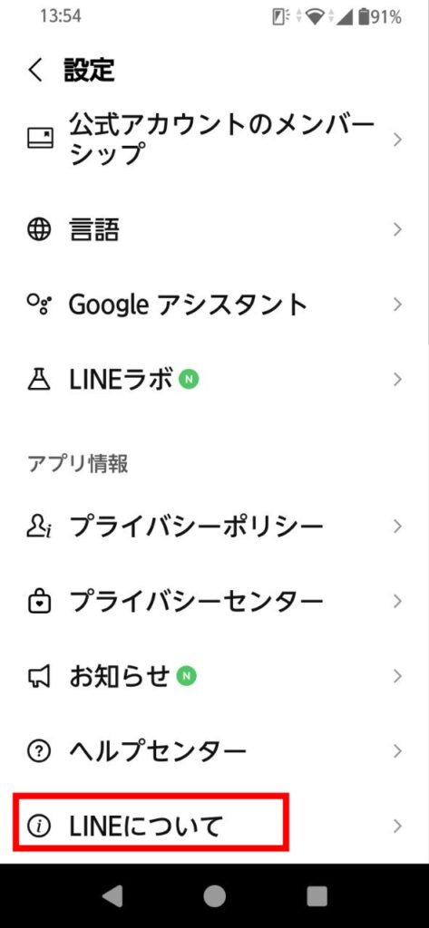 LINEアプリを開いて、ホーム画面の右上の歯車アイコン(設定)を押し、一番下の「LINEについて」から「現在のバージョン」を見ると分かります。